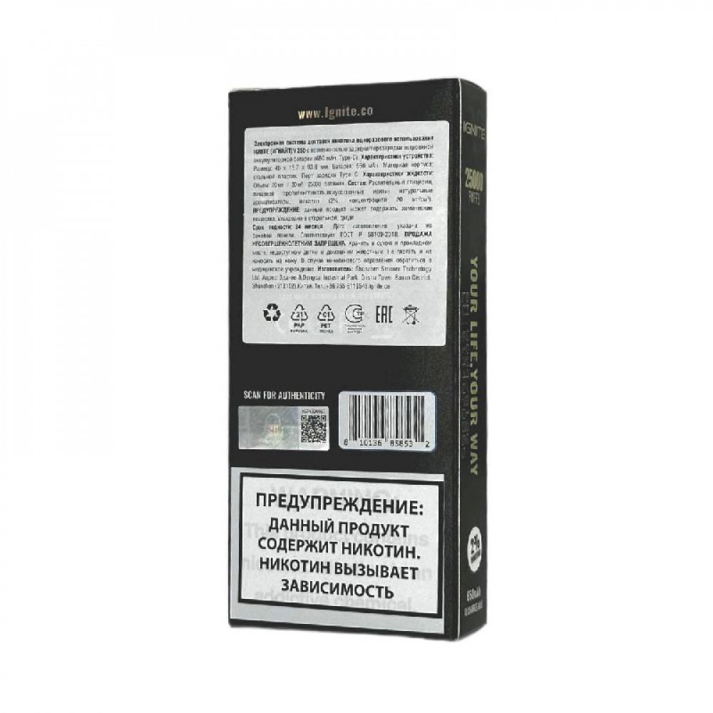Технические характеристики Электронная сигарета Ignite V250 Gold 25000 - Watermelon Ice (Ледяной арбуз)
